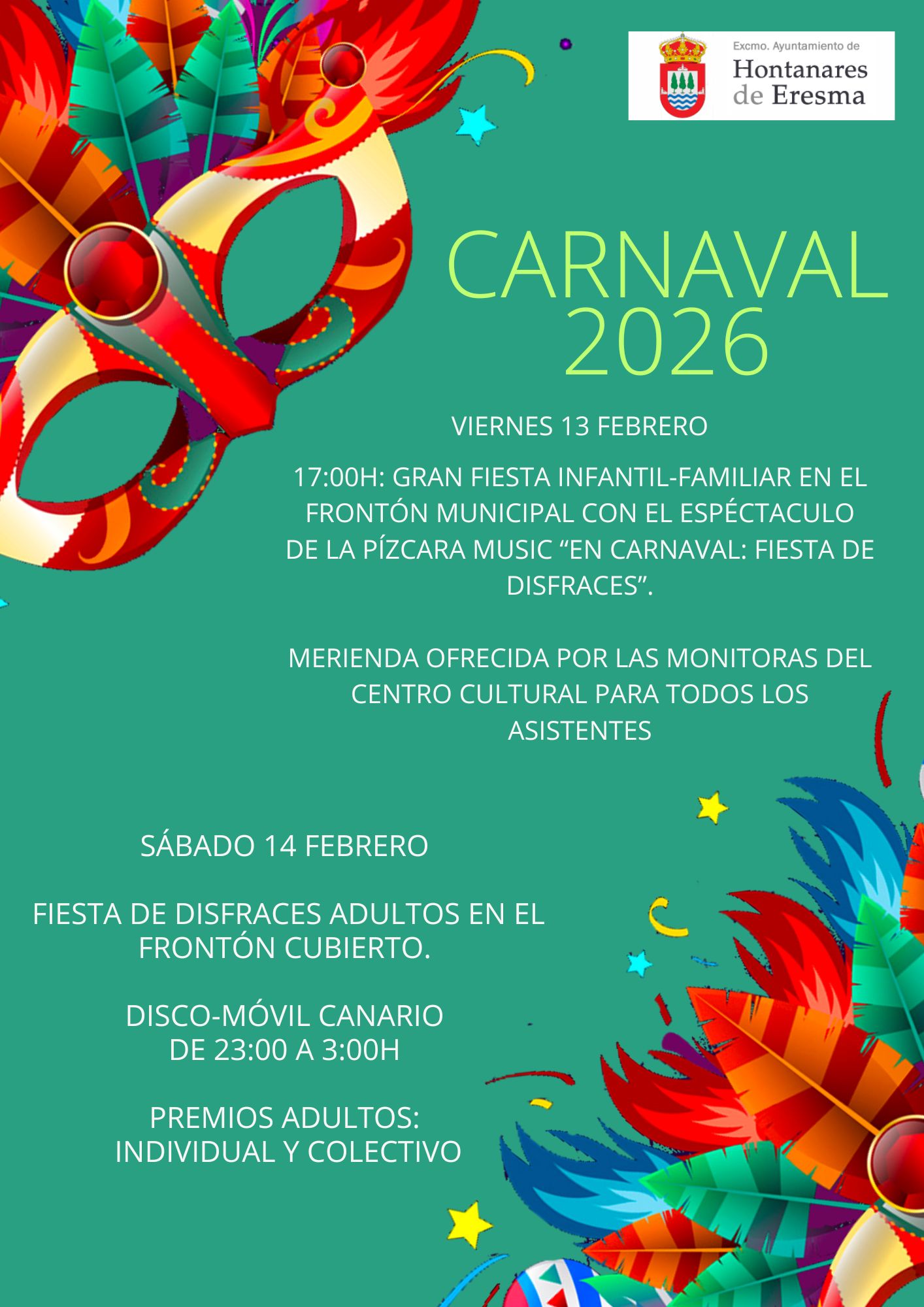 PROGRAMACIÓN DE CARNAVAL 2026 PARA TODAS LAS EDADES. ARRANCAREMOS EL VIERNES 13 CON LA FIESTA AMENIZADA POR LA PIZCARA MUSIC, CON FIESTA DE DISFRACES, ANIMACIÓN, MÚSICA, MERIENDA Y ALGUNA QUE OTRA SORPRESA EN EL FRONTÓN MUNICIPAL.