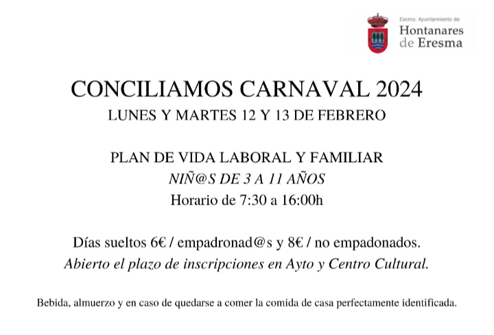 PLAN DE CONCILIACIÓN DE VIDA LABORAL Y FAMILIAR2024-02-01 13:30:38FiestasCON MOTIVO DE LAS VACACIONES DE CARNAVAL, EL AYUNTAMIENTO DE HONTANARES PONE EN MARCHA EL CAMPAMENTO DE CONCILIACIÓN DE VIDA LABORAL Y FAMILAR PARA LOS DÍAS 12 Y 13 DE FEBRERO EN HORARIO DE 7:30 A 16:00H.