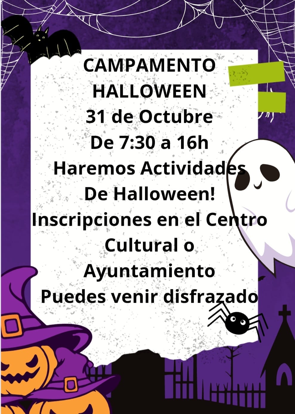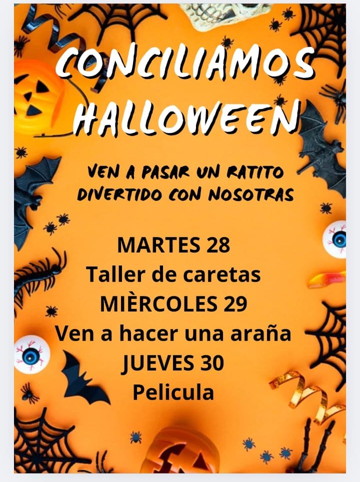 Abrimos inscripciones para el CAMPAMENTO DE CONCILIACIÓN DE VIDA LABORAL Y FAMILIAR en el Ayuntamiento y Centro Cultural. Además os adelantamos que durante esa semana se realizarán actividades con temática Halloween.